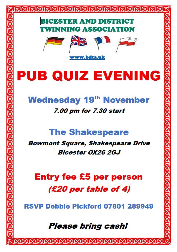 We are pleased that representatives from all three of our twin towns will be joining us in Bicester for the Remembrance Weekend to honour and remember those who gave their lives in the service of their countries. Their show of solidarity is much appreciated. The public are warmly invited to share in the event by gathering at Market Square before 11am on Sunday November 9th. The mayors or deputies of Czernichów, Essarts-en-Bocage and Neunkirchen-Seelscheid will be among those laying wreaths. There will be a parade, and two minutes silence will be observed at 11am. The Remembrance Service will then be held at St. Edburg’s Church beginning at 11.45am.