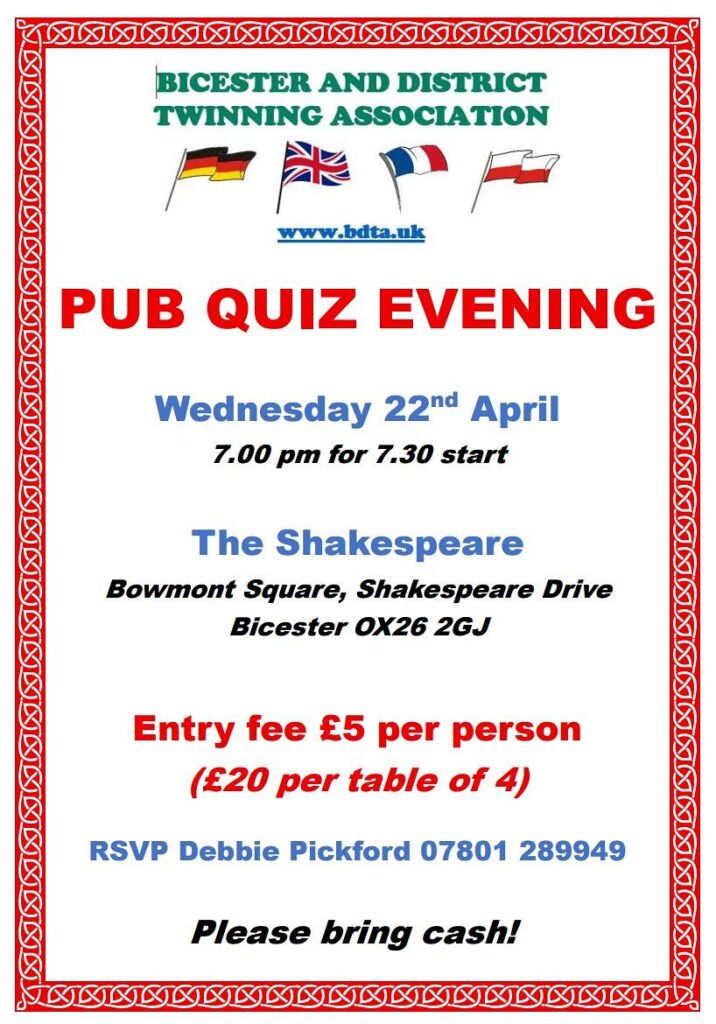 On the 19th November we held a hugely fun and very successful Quiz evening at The Shakespeare pub in west Bicester. There were nine teams racking their collective brains to try to answer questions on topics as varied as cartoon characters, American literature and assorted dingbats. We are enormously grateful to Paul the landlord for providing the venue and a prize for the winning team, Steve who did a grand job as quizmaster, having had to drive all the way back from Manchester to get there, and Debbie Pickford for organising the event. Huge thanks also to all who provided a variety of raffle prizes, especially local companies BRITA Water Filters and Ravensburger Jigsaw Puzzles. (Please support them.) And last but not least, thank you to all who came and took part in this event.