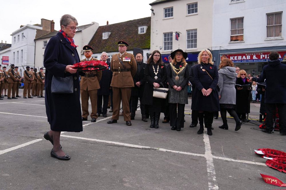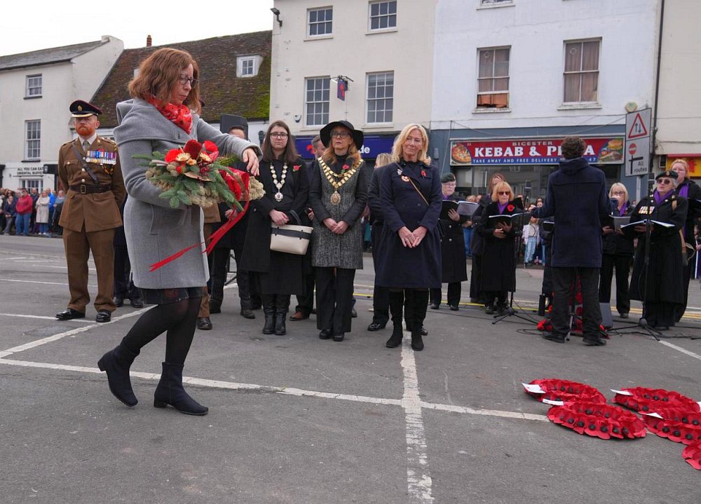 Val Pearce (Chairman) laying the wreath on behalf of the Bicester & District Twinning Association. Photo © Eddy Xi Gong